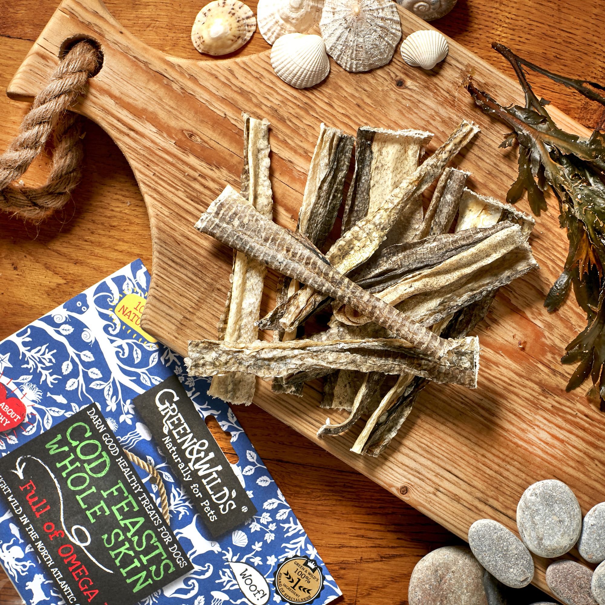 100% Natural Cod Skins caught wild in the North Atlantic Ocean. These Cod Skins are air-dried to hold in all that fishy goodness.