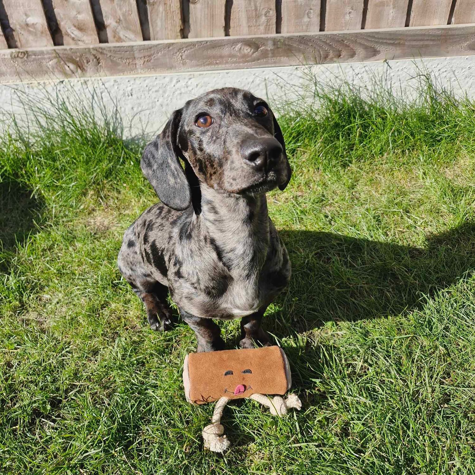 Made from a suede outer with natural jute fibre stuffing and plaited, jute rope legs, she's the safe, sweet treat for your dog to chew on!