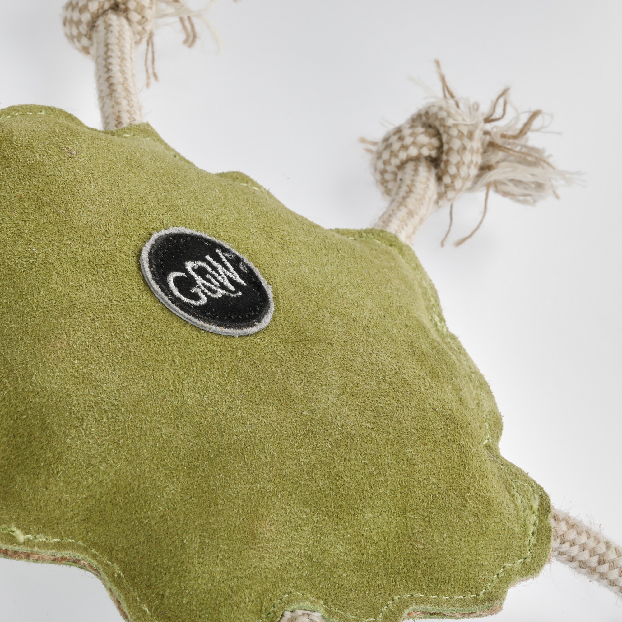 Made from a suede outer with natural jute fibre stuffing and jute rope legs. Jute is a natural, sustainable plant fibre. The suede is a by-product and ensures that this material is not wasted. Tough and long-lasting, made without using any compound that would harm or be released when chewed. Jute is 100% biodegradable.