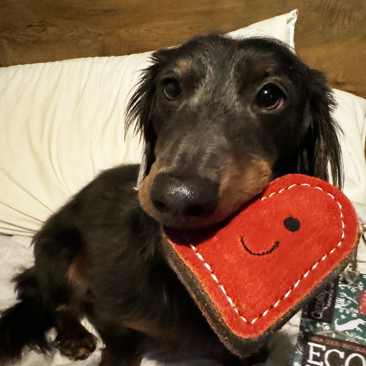 Isn't she lovely, isn't she wonderful....This little love heart made from layers of compressed felt and stitched over with soft suede, will make an adorable addition to any small dog's toy collection.