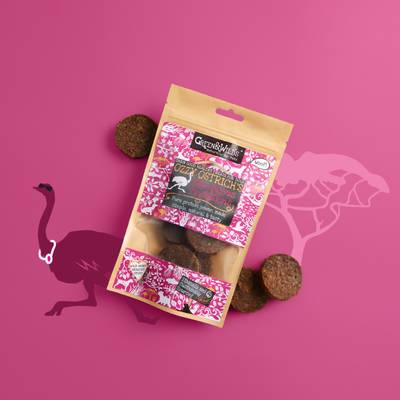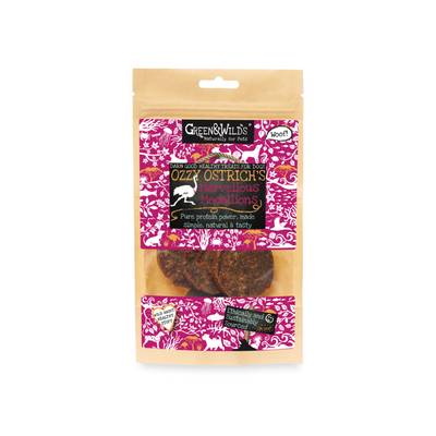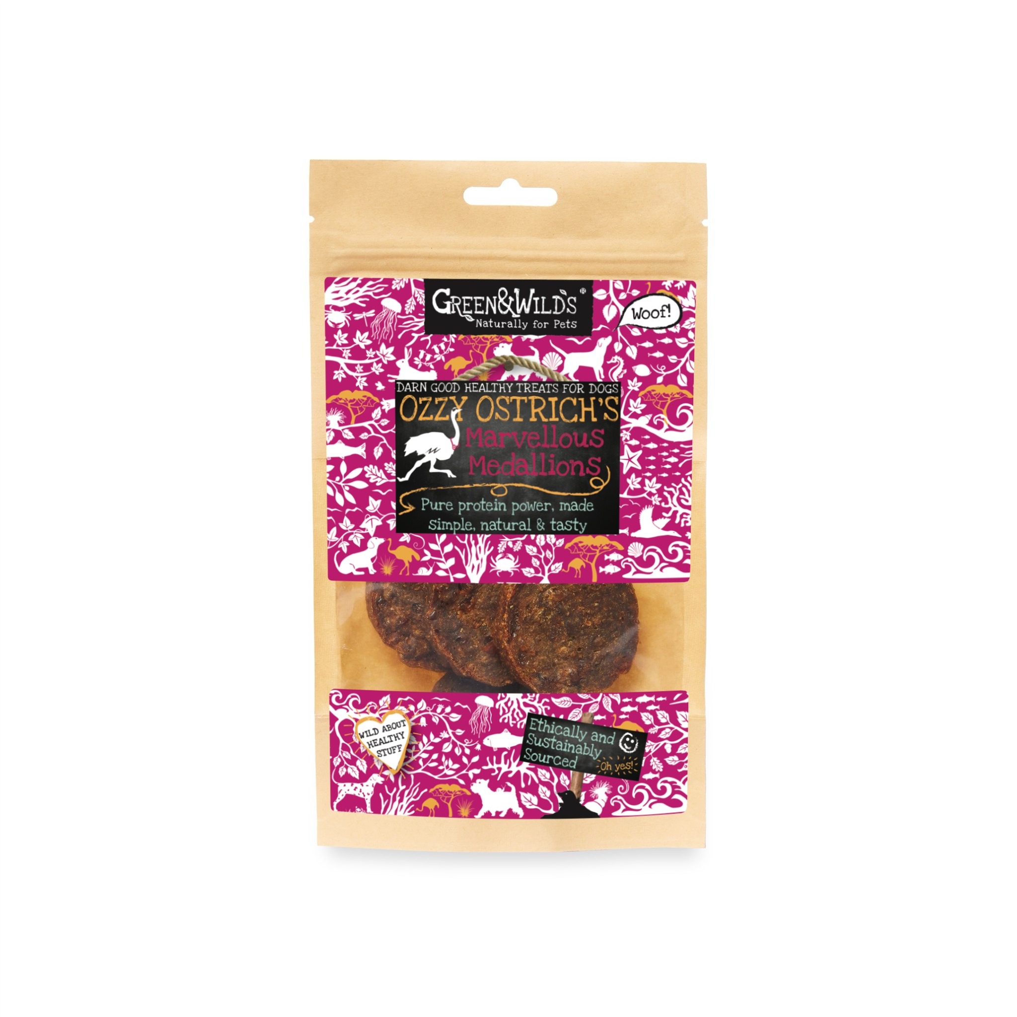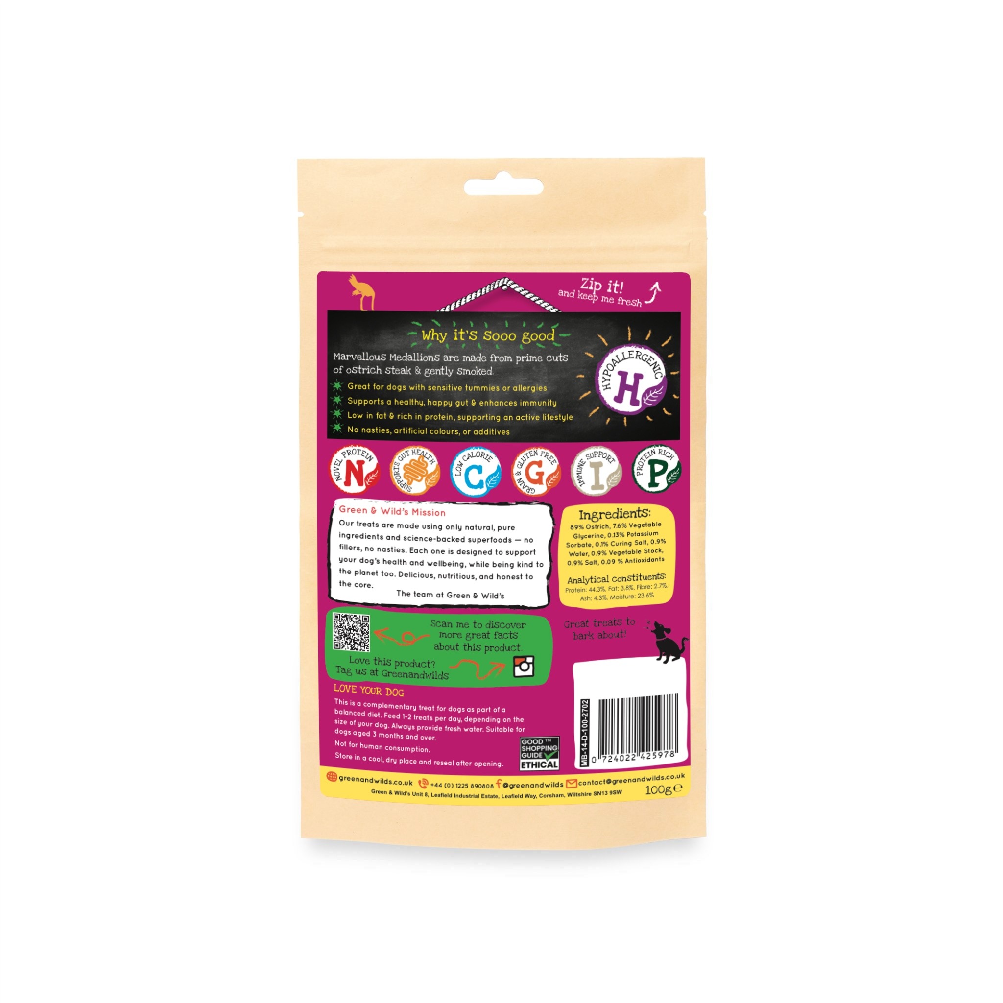 Our Marvellous Medallions are made from prime cuts of ostrich meat, air-dried and gently smoked to give them the wonderful aroma that dogs love. The smokiness also serves as a natural preservative, helping to maintain the products' freshness. Additionally, real wood chips are used during the smoking process, rather than artificial liquid smoke.