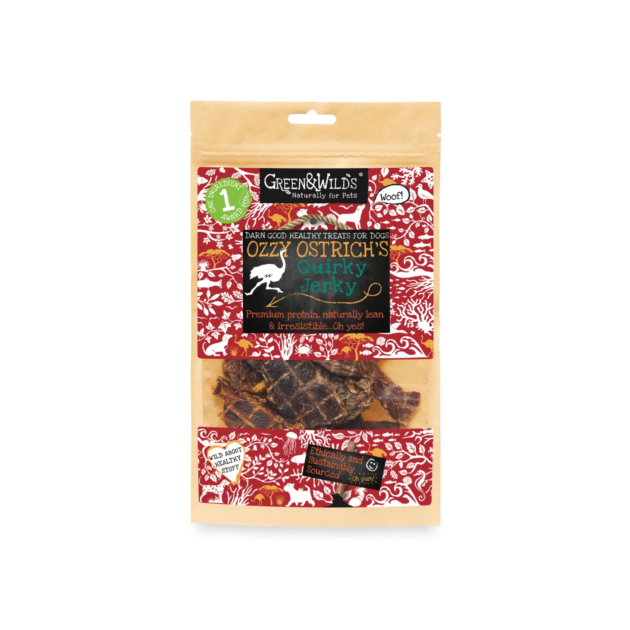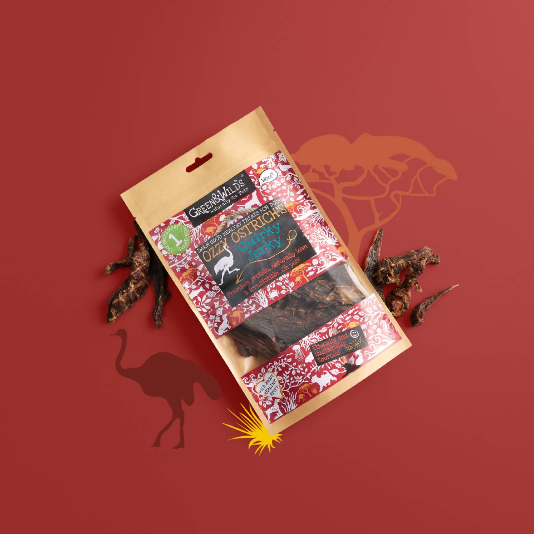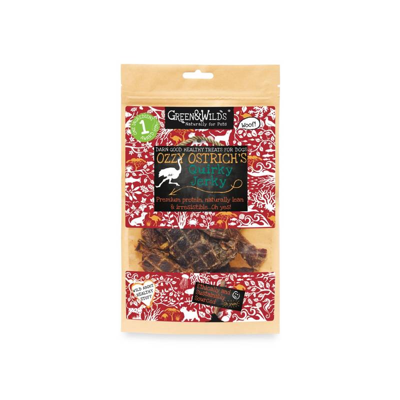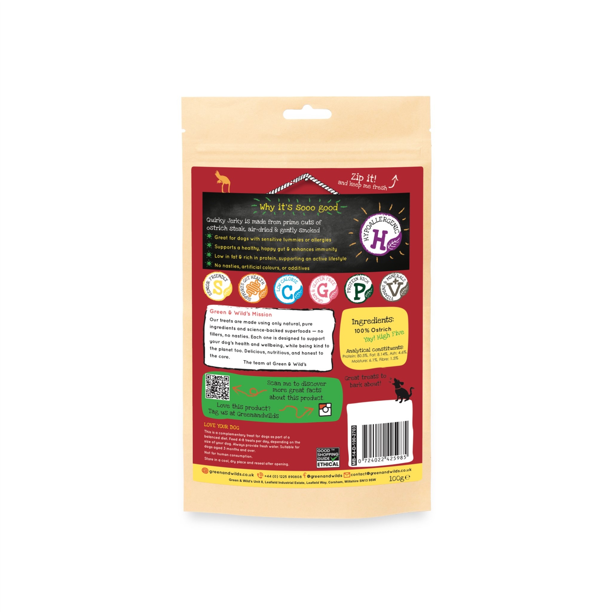 Our Quirky Jerky is made from prime cuts of ostrich steaks, air-dried and gently smoked to give it the wonderful aroma that dogs love. The smokiness also serves as a natural preservative, helping to maintain the products' freshness. Additionally, real wood chips are used during the smoking process, rather than artificial liquid smoke.