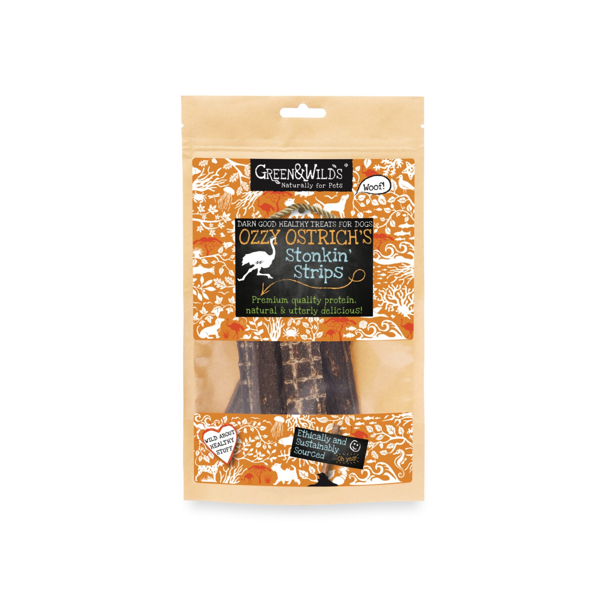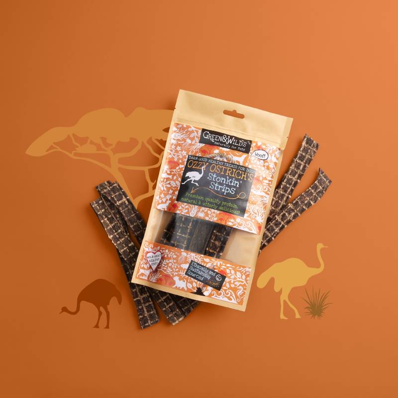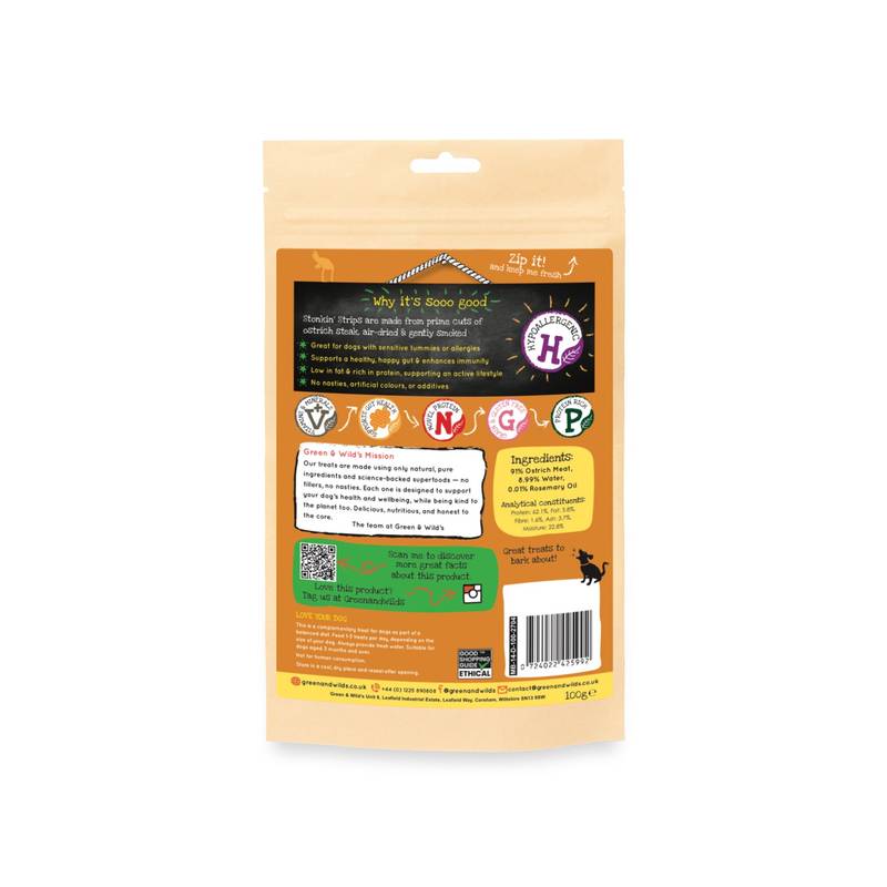 Our Stonkin' Strips are made from prime cuts of ostrich steaks, air-dried and gently smoked to give them the wonderful aroma that dogs love. The smokiness also serves as a natural preservative, helping to maintain the products' freshness. Additionally, real wood chips are used during the smoking process, rather than artificial liquid smoke. An exceptional, anytime snack or treat