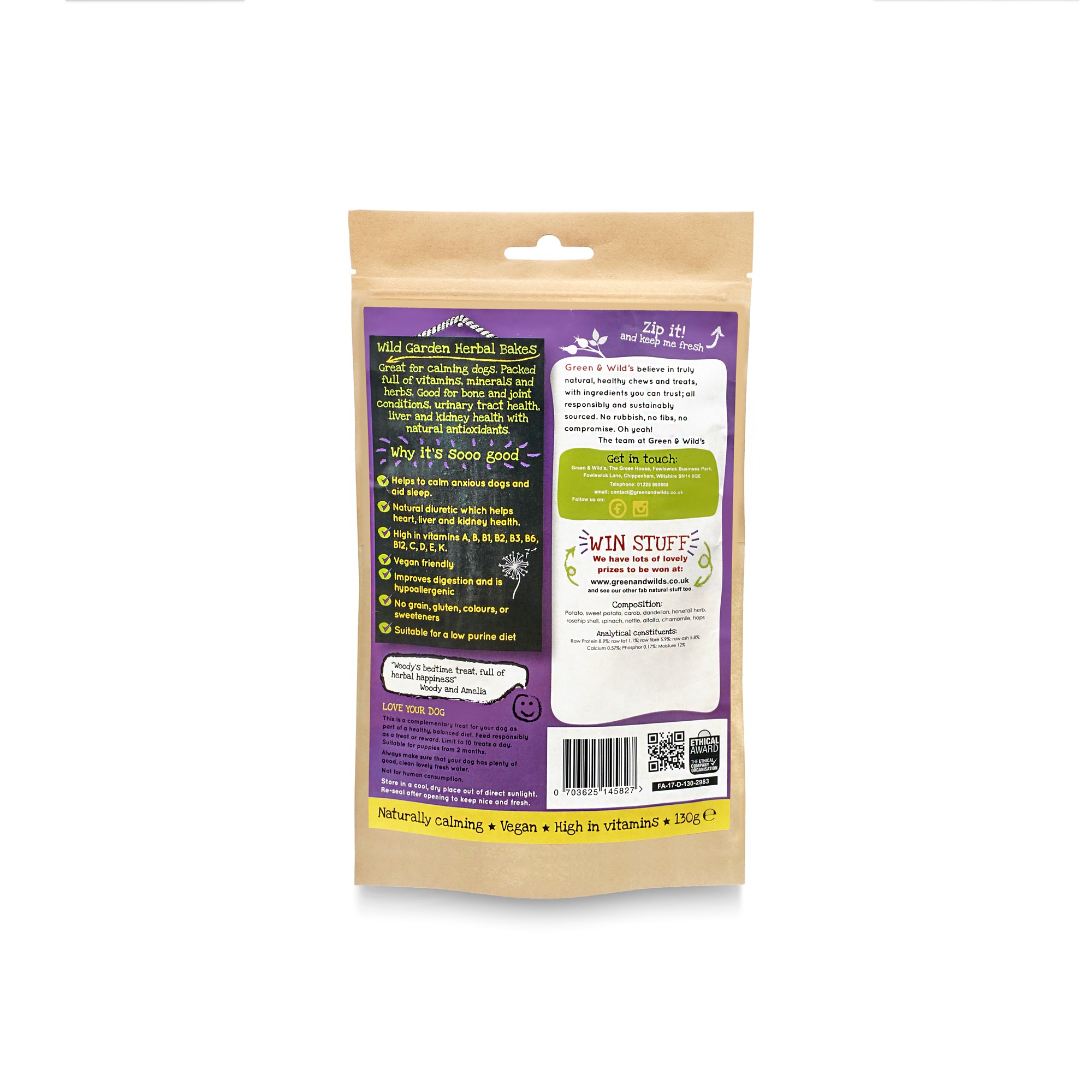 Our Wild Garden Herbal Bakes are packed full of vitamins, minerals, and herbs which are good for bone and joint conditions, urinary tract health, liver and kidney health, plus natural anti-oxidants. With dandelion, rosehip, spinach, nettle, alfalfa, chamomile, and carob, they are great for calming anxious dogs.